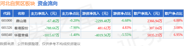 从资金流向上来看,当日河北自贸区板块主力资金净流出1871.79万元,游资资金净流出5837.42万元,散户资金净流入7709.2万元。河北自贸区板块个股资金流向见下表: