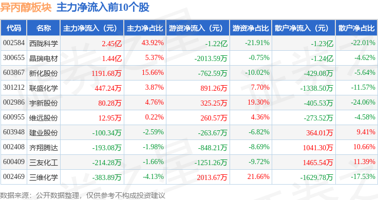 从资金流向上来看,当日异丙醇板块主力资金净流入9855.77万元,游资资金净流出1.63亿元,散户资金净流入6490.31万元。异丙醇板块个股资金流向见下表:
