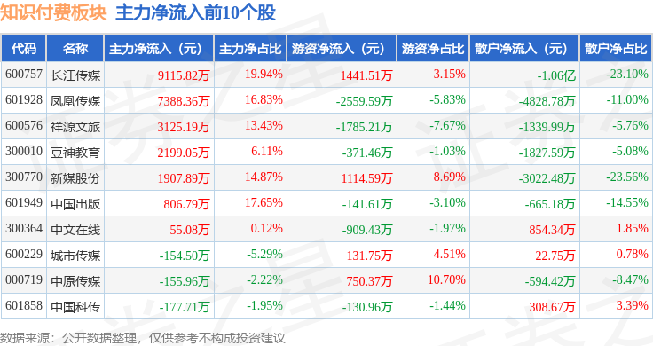 从资金流向上来看,当日知识付费板块主力资金净流入2770.33万元,游资资金净流出7079.4万元,散户资金净流入4309.06万元。知识付费板块个股资金流向见下表: