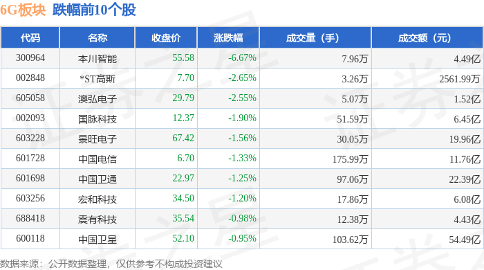 从资金流向上来看,当日6G板块主力资金净流出8.24亿元,游资资金净流入3838.2万元,散户资金净流入7.85亿元。6G板块个股资金流向见下表: