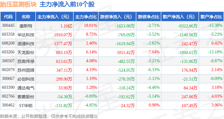 从资金流向上来看,当日胎压监测板块主力资金净流出1.16亿元,游资资金净流出9501.74万元,散户资金净流入2.11亿元。胎压监测板块个股资金流向见下表: