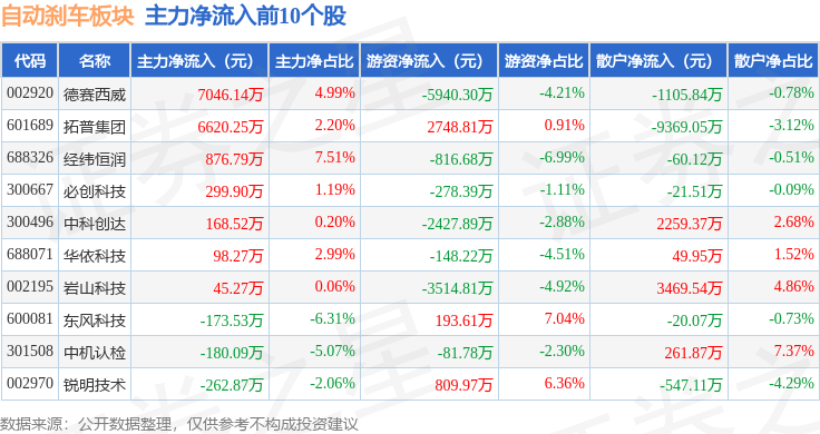 从资金流向上来看,当日自动刹车板块主力资金净流出1.8亿元,游资资金净流入625.63万元,散户资金净流入1.74亿元。自动刹车板块个股资金流向见下表:
