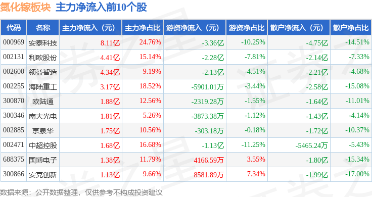 从资金流向上来看,当日氮化镓板块主力资金净流入9.65亿元,游资资金净流出11.43亿元,散户资金净流入1.78亿元。氮化镓板块个股资金流向见下表: