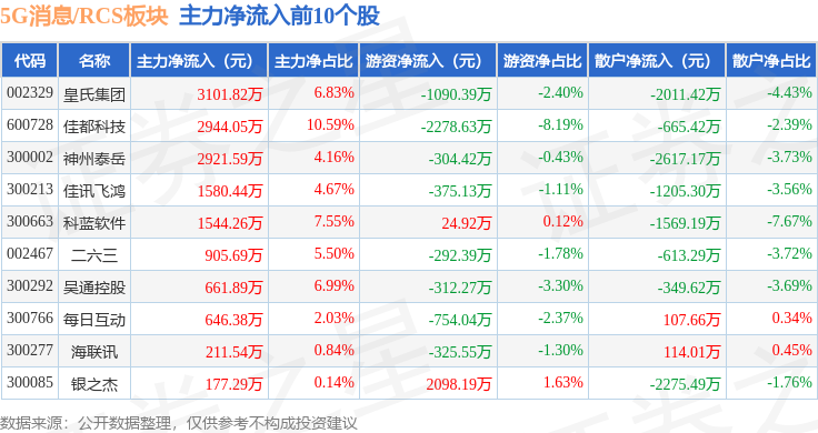 从资金流向上来看,当日5G消息/RCS板块主力资金净流出10.71亿元,游资资金净流入1.92亿元,散户资金净流入8.79亿元。5G消息/RCS板块个股资金流向见下表: