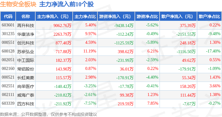 从资金流向上来看,当日生物安全板块主力资金净流入7139.75万元,游资资金净流出1.03亿元,散户资金净流入3193.41万元。生物安全板块个股资金流向见下表: