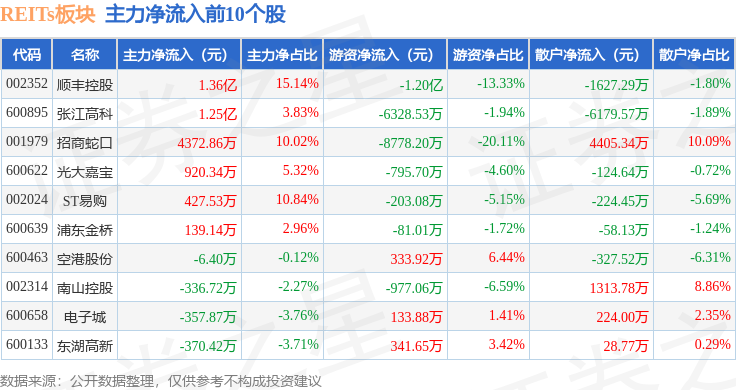 从资金流向上来看,当日REITs板块主力资金净流入1.15亿元,游资资金净流出2.45亿元,散户资金净流入1.3亿元。REITs板块个股资金流向见下表: