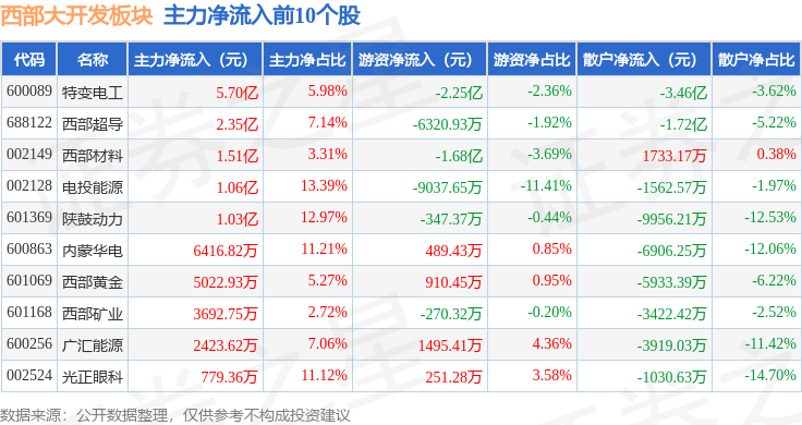 从资金流向上来看,当日西部大开发板块主力资金净流入8.16亿元,游资资金净流出4.6亿元,散户资金净流出3.56亿元。西部大开发板块个股资金流向见下表: