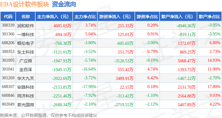 从资金流向上来看,当日EDA设计软件板块主力资金净流出9521.68万元,游资资金净流出2059.62万元,散户资金净流入1.16亿元。EDA设计软件板块个股资金流向见下表: