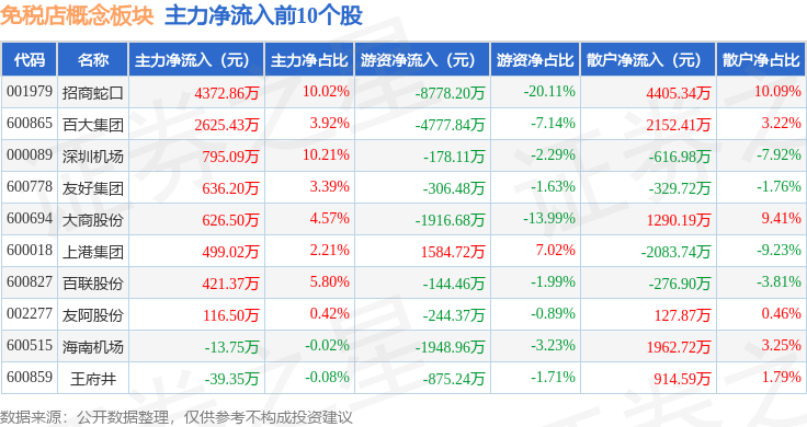 从资金流向上来看,当日免税店概念板块主力资金净流出8.99亿元,游资资金净流入2212.47万元,散户资金净流入8.77亿元。免税店概念板块个股资金流向见下表: