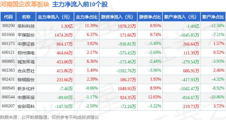 从资金流向上来看,当日河南国企改革板块主力资金净流出2.34亿元,游资资金净流入2117.56万元,散户资金净流入2.13亿元。河南国企改革板块个股资金流向见下表: