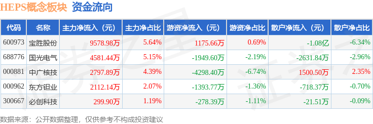 从资金流向上来看,当日HEPS概念板块主力资金净流入1.94亿元,游资资金净流出6744.49万元,散户资金净流出1.26亿元。HEPS概念板块个股资金流向见下表: