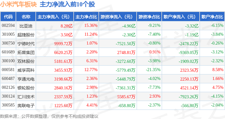 从资金流向上来看,当日小米汽车板块主力资金净流入9.64亿元,游资资金净流出10.72亿元,散户资金净流入1.07亿元。小米汽车板块个股资金流向见下表: