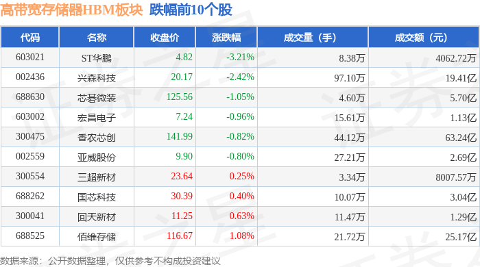 证券之星消息,12月12日高带宽存储器HBM板块较上一交易日上涨3.33%,华海诚科领涨。当日上证指数报收于3889.35,上涨0.41%。深证成指报收于13258.33,上涨0.84%。高带宽存储器HBM板块个股涨跌见下表: