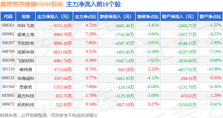 从资金流向上来看,当日高带宽存储器HBM板块主力资金净流出4.24亿元,游资资金净流出3.0亿元,散户资金净流入7.24亿元。高带宽存储器HBM板块个股资金流向见下表: