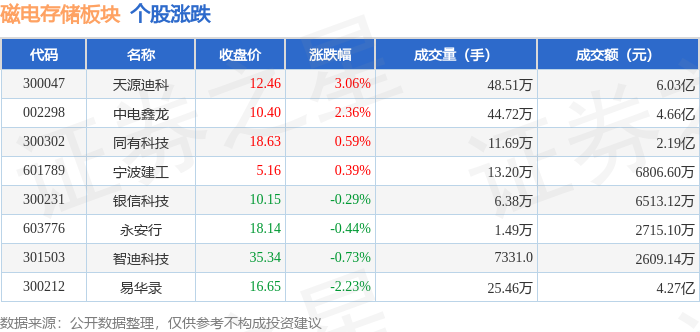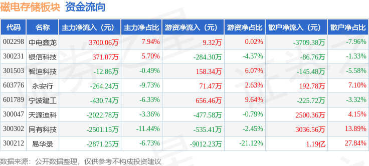 从资金流向上来看,当日磁电存储板块主力资金净流出4031.89万元,游资资金净流出9413.94万元,散户资金净流入1.34亿元。磁电存储板块个股资金流向见下表: