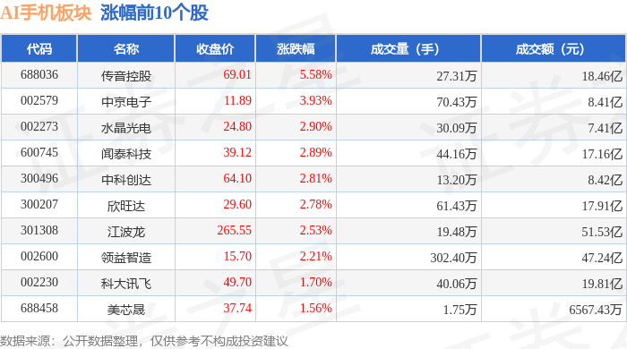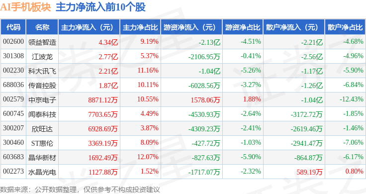 从资金流向上来看,当日AI手机板块主力资金净流出17.65亿元,游资资金净流入1.89亿元,散户资金净流入15.77亿元。AI手机板块个股资金流向见下表: