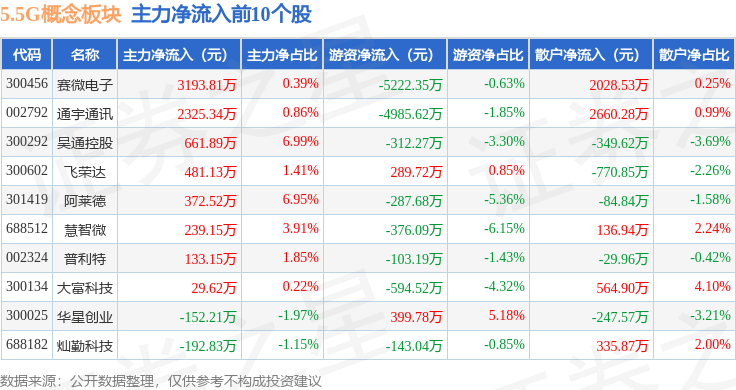 从资金流向上来看,当日5.5G概念板块主力资金净流出9.48亿元,游资资金净流出701.67万元,散户资金净流入9.55亿元。5.5G概念板块个股资金流向见下表: