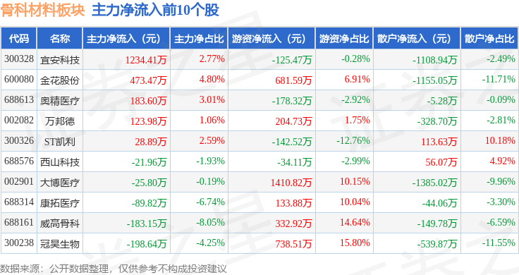 从资金流向上来看,当日骨科材料板块主力资金净流出3686.95万元,游资资金净流入4424.17万元,散户资金净流出737.22万元。骨科材料板块个股资金流向见下表: