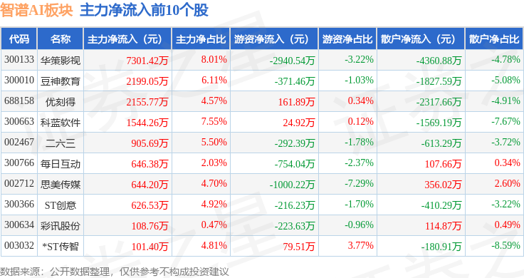 从资金流向上来看,当日智谱AI板块主力资金净流出18.63亿元,游资资金净流入5.87亿元,散户资金净流入12.76亿元。智谱AI板块个股资金流向见下表: