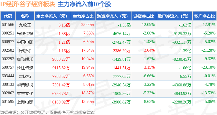 从资金流向上来看,当日IP经济/谷子经济板块主力资金净流入3.07亿元,游资资金净流出5.92亿元,散户资金净流入2.85亿元。IP经济/谷子经济板块个股资金流向见下表: