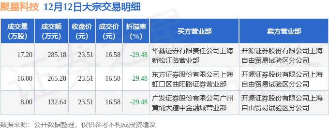 证券之星消息,12月12日聚星科技发生大宗交易,交易数据如下: