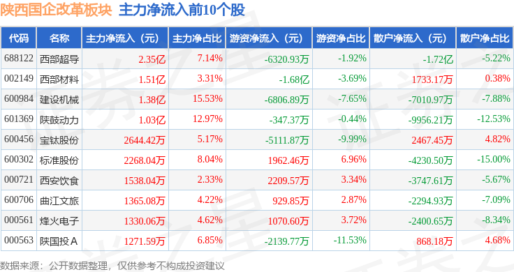 从资金流向上来看,当日陕西国企改革板块主力资金净流入3.58亿元,游资资金净流出3.34亿元,散户资金净流出2395.66万元。陕西国企改革板块个股资金流向见下表:
