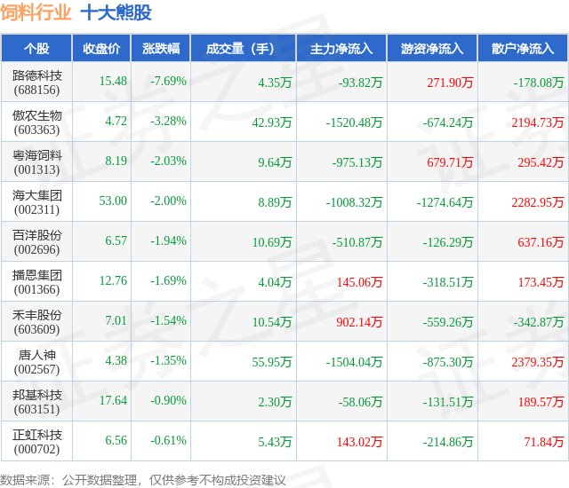 个股表现方面,饲料行业当日领跌股为路德科技(688156),该股当日报收15.48,下跌7.69%,成交量4.35万,主力资金净流出93.82万元。傲农生物(603363)以下跌3.28%紧随其后,该股当日成交量42.93万,主力资金净流出1520.48万元。除此之外,粤海饲料(001313)、海大集团(002311)、百洋股份(002696)均进入当日熊股之列。具体个股列表见下表: