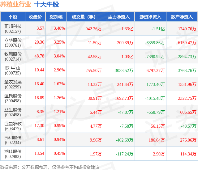 个股表现方面,养殖业行业当日领涨股为正邦科技(002157),该股当日报收3.57,上涨3.48%,成交量942.26万,主力资金净流入1.33亿元。立华股份(300761)以上涨3.25%紧随其后,该股当日成交量11.5万,主力资金净流入200.39万元。除此之外,牧原股份(002714)、罗 牛 山(000735)、圣农发展(002299)均进入当日牛股之列。具体个股列表见下表: