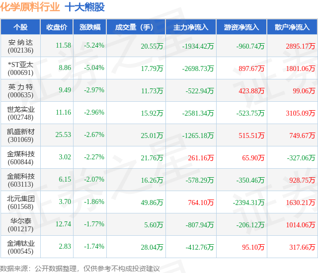 个股表现方面,化学原料行业当日领跌股为安 纳 达(002136),该股当日报收11.58,下跌5.24%,成交量20.55万,主力资金净流出1934.42万元。*ST亚太(000691)以下跌5.04%紧随其后,该股当日成交量17.79万,主力资金净流出2698.73万元。除此之外,英 力 特(000635)、世龙实业(002748)、凯盛新材(301069)均进入当日熊股之列。具体个股列表见下表: