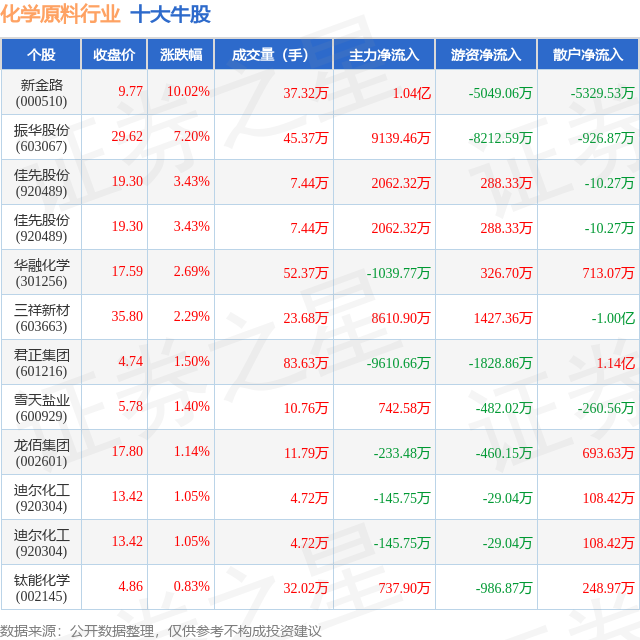 个股表现方面,化学原料行业当日领涨股为新金路(000510),该股当日报收9.77,上涨10.02%,成交量37.32万,主力资金净流入1.04亿元。振华股份(603067)以上涨7.2%紧随其后,该股当日成交量45.37万,主力资金净流入9139.46万元。除此之外,佳先股份(920489)、佳先股份(920489)、华融化学(301256)均进入当日牛股之列。具体个股列表见下表: