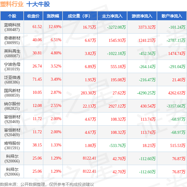 个股表现方面,塑料行业当日领涨股为蓝晓科技(300487),该股当日报收61.52,上涨12.69%,成交量16.75万,主力资金净流出3272.08万元。奇德新材(300995)以上涨6.51%紧随其后,该股当日成交量6.67万,主力资金净流入1545.93万元。除此之外,英科再生(688087)、宁波色母(301019)、泛亚微透(688386)均进入当日牛股之列。具体个股列表见下表: