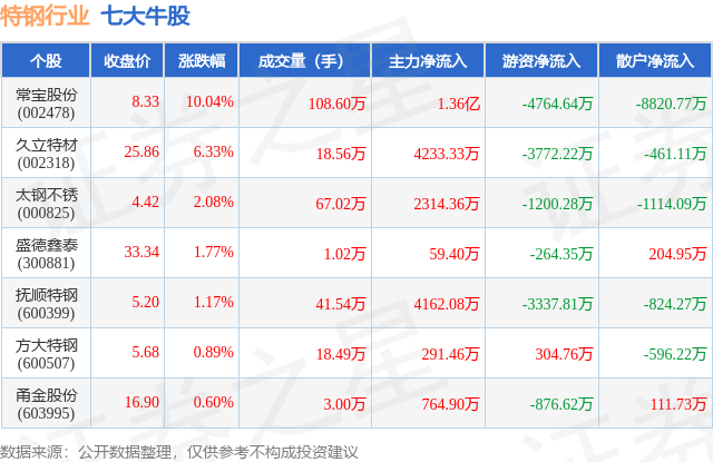 个股表现方面,特钢行业当日领涨股为常宝股份(002478),该股当日报收8.33,上涨10.04%,成交量108.6万,主力资金净流入1.36亿元。久立特材(002318)以上涨6.33%紧随其后,该股当日成交量18.56万,主力资金净流入4233.33万元。除此之外,太钢不锈(000825)、盛德鑫泰(300881)、抚顺特钢(600399)均进入当日牛股之列。具体个股列表见下表: