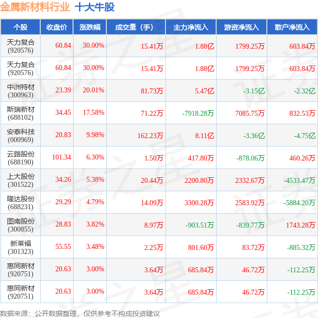 个股表现方面,金属新材料行业当日领涨股为天力复合(920576),该股当日报收60.84,上涨30.0%,成交量15.41万,主力资金净流入1.88亿元。天力复合(920576)以上涨30.0%紧随其后,该股当日成交量15.41万,主力资金净流入1.88亿元。除此之外,中洲特材(300963)、斯瑞新材(688102)、安泰科技(000969)均进入当日牛股之列。具体个股列表见下表: