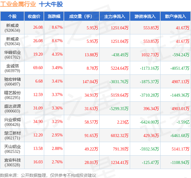 个股表现方面,工业金属行业当日领涨股为新威凌(920634),该股当日报收26.08,上涨8.67%,成交量5.95万,主力资金净流入1251.04万元。新威凌(920634)以上涨8.67%紧随其后,该股当日成交量5.95万,主力资金净流入1251.04万元。除此之外,华峰铝业(601702)、金诚信(603979)、驰宏锌锗(600497)均进入当日牛股之列。具体个股列表见下表: