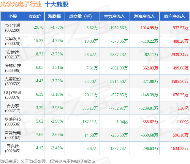 个股表现方面,光学光电子行业当日领跌股为*ST宇顺(002289),该股当日报收29.78,下跌4.73%,成交量3.62万,主力资金净流出1952.56万元。深华发A(000020)以下跌4.72%紧随其后,该股当日成交量10.0万,主力资金净流出378.06万元。除此之外,实益达(002137)、清越科技(688496)、光莆股份(300632)均进入当日熊股之列。具体个股列表见下表:
