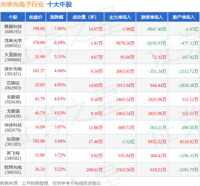 个股表现方面,光学光电子行业当日领涨股为腾景科技(688195),该股当日报收196.6,上涨7.66%,成交量14.97万,主力资金净流入1.96亿元。茂莱光学(688502)以上涨6.18%紧随其后,该股当日成交量1.81万,主力资金净流入9670.26万元。除此之外,久量股份(300808)、波长光电(301421)、芯瑞达(002983)均进入当日牛股之列。具体个股列表见下表: