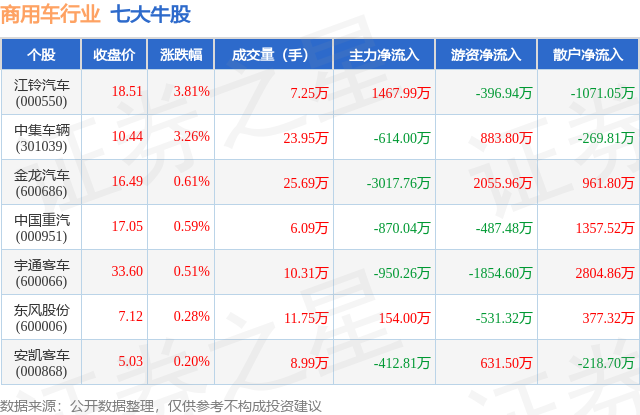 个股表现方面,商用车行业当日领涨股为江铃汽车(000550),该股当日报收18.51,上涨3.81%,成交量7.25万,主力资金净流入1467.99万元。中集车辆(301039)以上涨3.26%紧随其后,该股当日成交量23.95万,主力资金净流出614.0万元。除此之外,金龙汽车(600686)、中国重汽(000951)、宇通客车(600066)均进入当日牛股之列。具体个股列表见下表: