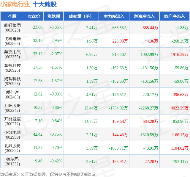 个股表现方面,小家电行业当日领跌股为彩虹集团(003023),该股当日报收23.68,下跌3.35%,成交量7.41万,主力资金净流出683.55万元。飞科电器(603868)以下跌2.95%紧随其后,该股当日成交量1.98万,主力资金净流入223.93万元。除此之外,莱克电气(603355)、鸿智科技(920926)、鸿智科技(920926)均进入当日熊股之列。具体个股列表见下表: