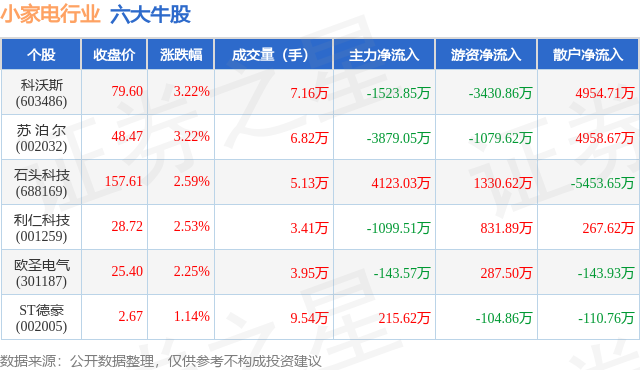 个股表现方面,小家电行业当日领涨股为科沃斯(603486),该股当日报收79.6,上涨3.22%,成交量7.16万,主力资金净流出1523.85万元。苏 泊 尔(002032)以上涨3.22%紧随其后,该股当日成交量6.82万,主力资金净流出3879.05万元。除此之外,石头科技(688169)、利仁科技(001259)、欧圣电气(301187)均进入当日牛股之列。具体个股列表见下表: