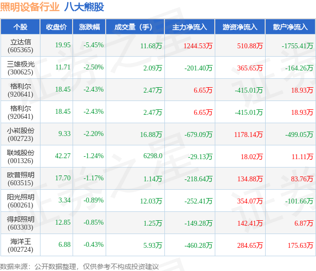 个股表现方面,照明设备行业当日领跌股为立达信(605365),该股当日报收19.95,下跌5.45%,成交量11.68万,主力资金净流入1244.53万元。三雄极光(300625)以下跌2.5%紧随其后,该股当日成交量2.09万,主力资金净流出201.4万元。除此之外,格利尔(920641)、格利尔(920641)、小崧股份(002723)均进入当日熊股之列。具体个股列表见下表: