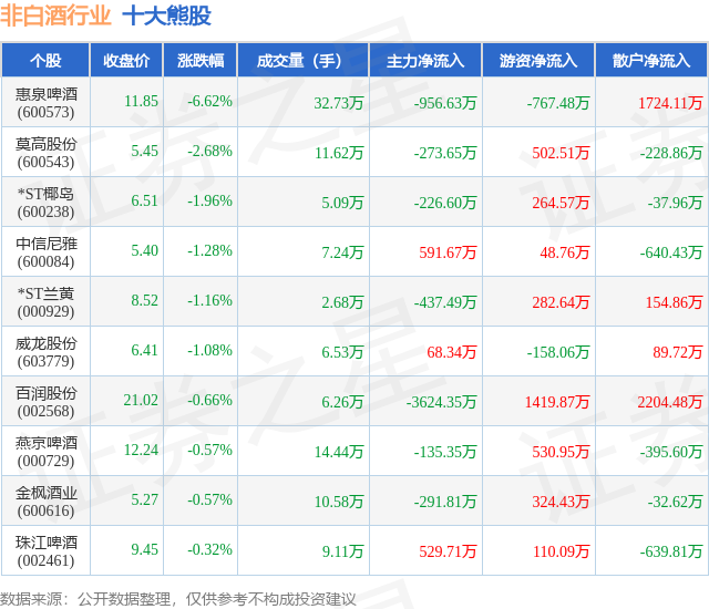 个股表现方面,非白酒行业当日领跌股为惠泉啤酒(600573),该股当日报收11.85,下跌6.62%,成交量32.73万,主力资金净流出956.63万元。莫高股份(600543)以下跌2.68%紧随其后,该股当日成交量11.62万,主力资金净流出273.65万元。除此之外,*ST椰岛(600238)、中信尼雅(600084)、*ST兰黄(000929)均进入当日熊股之列。具体个股列表见下表: