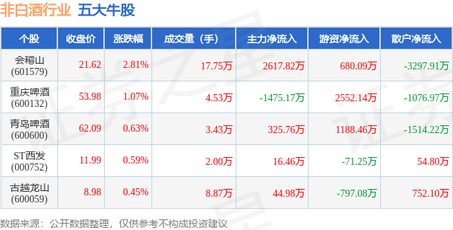 个股表现方面,非白酒行业当日领涨股为会稽山(601579),该股当日报收21.62,上涨2.81%,成交量17.75万,主力资金净流入2617.82万元。重庆啤酒(600132)以上涨1.07%紧随其后,该股当日成交量4.53万,主力资金净流出1475.17万元。除此之外,青岛啤酒(600600)、ST西发(000752)、古越龙山(600059)均进入当日牛股之列。具体个股列表见下表: