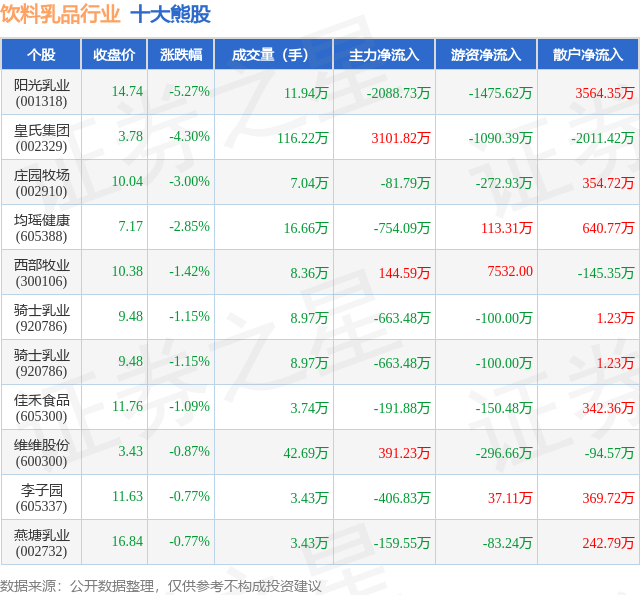 个股表现方面,饮料乳品行业当日领跌股为阳光乳业(001318),该股当日报收14.74,下跌5.27%,成交量11.94万,主力资金净流出2088.73万元。皇氏集团(002329)以下跌4.3%紧随其后,该股当日成交量116.22万,主力资金净流入3101.82万元。除此之外,庄园牧场(002910)、均瑶健康(605388)、西部牧业(300106)均进入当日熊股之列。具体个股列表见下表: