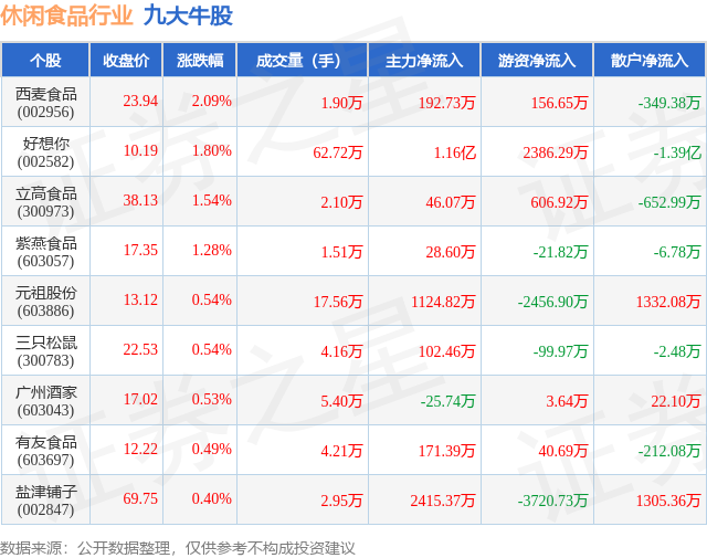 个股表现方面,休闲食品行业当日领涨股为西麦食品(002956),该股当日报收23.94,上涨2.09%,成交量1.9万,主力资金净流入192.73万元。好想你(002582)以上涨1.8%紧随其后,该股当日成交量62.72万,主力资金净流入1.16亿元。除此之外,立高食品(300973)、紫燕食品(603057)、元祖股份(603886)均进入当日牛股之列。具体个股列表见下表: