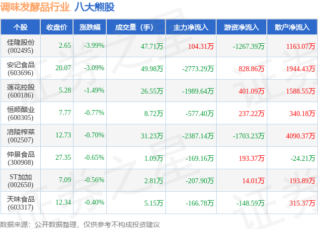 个股表现方面,调味发酵品行业当日领跌股为佳隆股份(002495),该股当日报收2.65,下跌3.99%,成交量47.71万,主力资金净流入104.31万元。安记食品(603696)以下跌3.09%紧随其后,该股当日成交量49.98万,主力资金净流出2773.29万元。除此之外,莲花控股(600186)、恒顺醋业(600305)、涪陵榨菜(002507)均进入当日熊股之列。具体个股列表见下表: