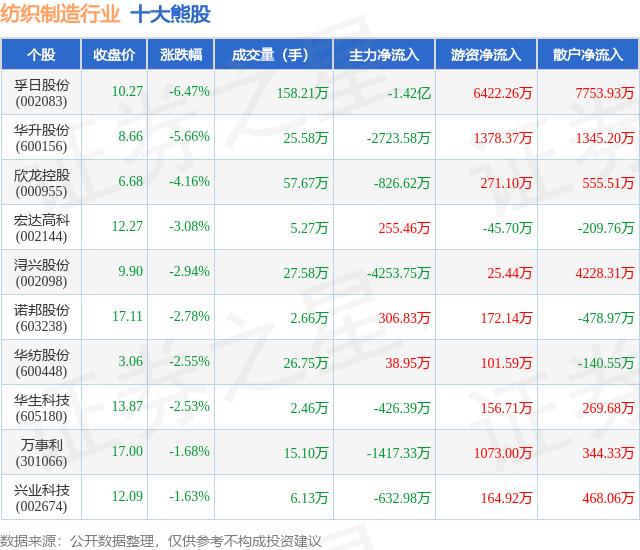 个股表现方面,纺织制造行业当日领跌股为孚日股份(002083),该股当日报收10.27,下跌6.47%,成交量158.21万,主力资金净流出1.42亿元。华升股份(600156)以下跌5.66%紧随其后,该股当日成交量25.58万,主力资金净流出2723.58万元。除此之外,欣龙控股(000955)、宏达高科(002144)、浔兴股份(002098)均进入当日熊股之列。具体个股列表见下表: