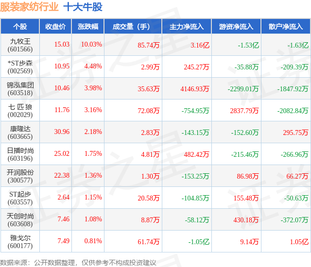 个股表现方面,服装家纺行业当日领涨股为九牧王(601566),该股当日报收15.03,上涨10.03%,成交量85.74万,主力资金净流入3.16亿元。*ST步森(002569)以上涨4.48%紧随其后,该股当日成交量2.99万,主力资金净流入245.27万元。除此之外,锦泓集团(603518)、七 匹 狼(002029)、康隆达(603665)均进入当日牛股之列。具体个股列表见下表: