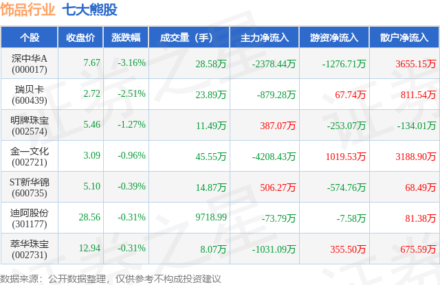 个股表现方面,饰品行业当日领跌股为深中华A(000017),该股当日报收7.67,下跌3.16%,成交量28.58万,主力资金净流出2378.44万元。瑞贝卡(600439)以下跌2.51%紧随其后,该股当日成交量23.89万,主力资金净流出879.28万元。除此之外,明牌珠宝(002574)、金一文化(002721)、ST新华锦(600735)均进入当日熊股之列。具体个股列表见下表: