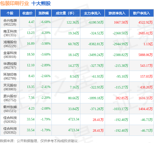 个股表现方面,包装印刷行业当日领跌股为合兴包装(002228),该股当日报收4.47,下跌6.68%,成交量122.36万,主力资金净流出6190.5万元。南王科技(301355)以下跌4.2%紧随其后,该股当日成交量19.34万,主力资金净流出324.52万元。除此之外,鸿博股份(002229)、金富科技(003018)、华源控股(002787)均进入当日熊股之列。具体个股列表见下表: