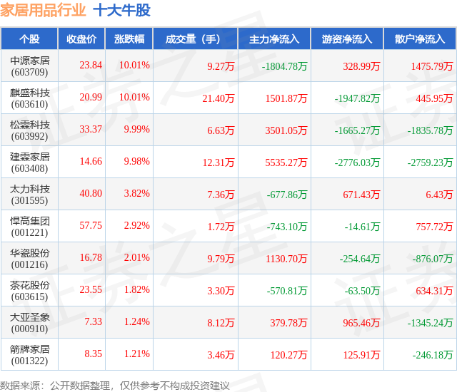 个股表现方面,家居用品行业当日领涨股为中源家居(603709),该股当日报收23.84,上涨10.01%,成交量9.27万,主力资金净流出1804.78万元。麒盛科技(603610)以上涨10.01%紧随其后,该股当日成交量21.4万,主力资金净流入1501.87万元。除此之外,松霖科技(603992)、建霖家居(603408)、太力科技(301595)均进入当日牛股之列。具体个股列表见下表: